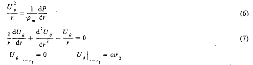 式中,Uθ為柱狀坐標中沿θ方向上的線速度;P為圓柱環(huán)中的壓力;這里r代表徑向坐標;r1為軸承外半徑;r2為軸承外殼體內(nèi)半徑。式(7)為歐拉方程,令r=et(t為中間變量),則t=1nr,對應式(7)的特征方程為