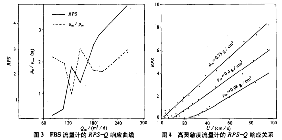 多相流動中,U和μm/ρm隨溫度、壓力、油氣水的含量的變化而變化。圖3是利用斯倫貝謝的FBS流量計由實驗作出的RPS-Q響應曲線,從圖中可見,隨μm/ρm的突變,RPS值也發(fā)生了響應的劇烈變化。