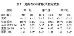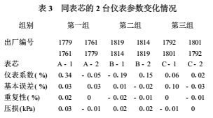 將每組儀表的2臺表芯對換,重新進(jìn)行檢定,獲取檢定數(shù)據(jù),列于表2。將同表芯的2臺儀表參數(shù)進(jìn)行比較,獲得比對結(jié)果,列于表3。其中儀表系數(shù)以相對(百分?jǐn)?shù))表示。