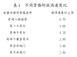 式中:L—上游直管段長度;f—管道內(nèi)摩擦系數(shù),處于紊流狀態(tài)時f=0.0175;Dg—流量計的公稱直徑;k—漩渦速度比,由流量計前管路情況確定(見表1)。
