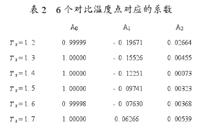 Z值可根據(jù)通用曲線圖確定或利用狀態(tài)方程算出。為計算方便,多采用對曲線進行二次擬合的方法來近似求得Z值。在求解Z值的時候,在所研究的對比溫度的范圍內(nèi)選取了6個均勻分布于研究范圍內(nèi)的Tr點為參照點(見表2),得到Z與Pr之間的簡單函數(shù)關(guān)系。通過數(shù)據(jù)分析,利用*小二乘法對曲線進行擬合,得到Z求值公式如下:
