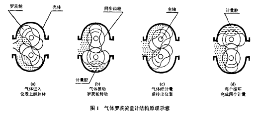 氣體羅茨流量計是一種容積式流量儀表。當氣體通過流量計時,在入口和出口間產生的壓差,作用在與高精密同步齒輪聯結在一起的一對羅茨輪上,從而驅動羅茨輪旋轉。在這期間,羅茨輪與殼體內壁和壓蓋之間形成的密閉空間——計量腔周期地充氣和排氣。羅茨輪的轉數與通過流量計的氣體體積量成正比。羅茨輪的旋轉經磁耦合器傳遞給機械計數器(或輸出流量脈沖信號),從而累積流經計量腔的體積量實現計量的目的。其原理如圖l。