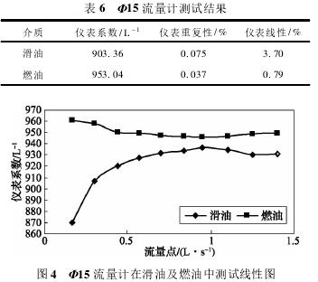 依據(jù)表5測試數(shù)據(jù),經(jīng)計算可得,Φ15流量計在滑油及燃油中測試結果如表6所示,測試線性圖如圖4所示。