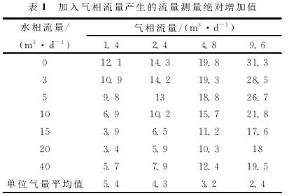 利用清水中渦輪的刻度方程計算加入不同氣體流量后渦輪響應(yīng)頻率所對應(yīng)的流量,即為加入氣體后的測量流量,再用所得測量流量減去配比的標準水流量,得到氣相加入后測量的絕對增加值,即加入氣相流量產(chǎn)生的測量誤差(見表1)。計算結(jié)果表明,加入氣體流量后,渦輪的測量流量明顯增加,尤其是液相流量較低時,增加的測量流量更高,氣體對流量測量產(chǎn)生了較大的測量誤差。低氣量下,平均1m3/d的氣量產(chǎn)生的測量誤差大約相當(dāng)于5m3/d(絕對增加值)。