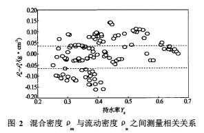 我們希望用測量的三相流混合密度ρm來表示流動密度ρn,但是,這二者在實驗測量關(guān)系上呈現(xiàn)復(fù)雜變化關(guān)系(見圖2),需要從多相流流動模型出發(fā),依托密度-持水率計在模擬井中的動態(tài)測量結(jié)果,來建立確定三相流流動密度的數(shù)學(xué)模型。