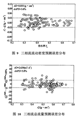 其中,系數(shù)C及D隨含氣率Kg的實驗擬合關(guān)系如圖7及圖8所示。聯(lián)立式(10)、(11)及(12),采用迭代求解法就可以計算得到三相流流動密度值。圖9為計算得到的流動密度與模擬井實驗標定的流動密度比較結(jié)果。可以看出,絕大部分實驗點的流動密度預(yù)測偏差落在-0.03與0.03誤差線之間(圖9中ρnn表示預(yù)測流動密度,ρn為模擬井標定流動密度),其絕對平均誤差為AD=0.018g/cm³,絕對平均相對誤差為AAPD=3.6%,與圖2所示的實驗關(guān)系相比,其三相流流動密度的預(yù)測精度是令人滿意的。聯(lián)立方程(4)、(10)、(11)及(12)式,采用非線性方程組迭代解法就可以預(yù)測得到三相流總流量。圖10為預(yù)測總流量誤差結(jié)果,其絕對平均誤差為AD=2.639m³/d,絕對平均相對誤差為AAPD=5.8%,取得了較高精度的油氣水三相流總流量預(yù)測結(jié)果。