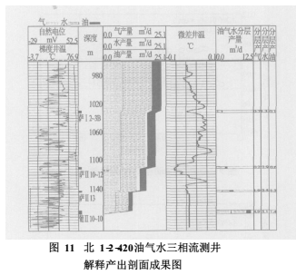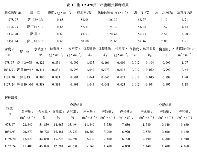 用本文提出的總流量預(yù)測模型共處理了8口含氣油井的三相流測井資料。圖11為北1-2-420井三相流測井資料處理實例,其解釋結(jié)果見表1。經(jīng)對8口含氣油井的實際處理效果表明,傘集流三相流測井組合儀可以較準確地確定油井油氣水三相流產(chǎn)出剖面。