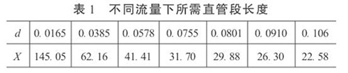 3.直管段長度和漂白劑流量計(jì)精度的初步預(yù)測在工程設(shè)計(jì)中,根據(jù)流體性質(zhì)、流量和雷諾數(shù)確定α和d值。這樣,按照式(5)就可以依不同的流量計(jì)精度要求,對直管段長度進(jìn)行初步預(yù)測,或確定直管段長度后,對流量計(jì)的精度做初步預(yù)測。當(dāng)δ= 0.2%時(shí),不同流量下所需直管段長度見表1。