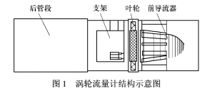 渦輪流量計結(jié)構(gòu)示意圖如圖1所示,主要組件包括前導(dǎo)流器、葉輪、支架以及后管段。流體從機殼進口流入,*先經(jīng)過前導(dǎo)流器,前導(dǎo)流器對流體流動有如下兩個重要作用: