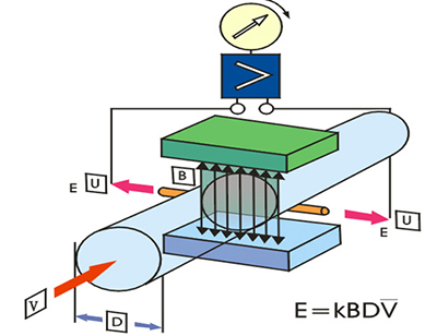 用水流量計工作原理是法拉*電磁感應定律,即導體在磁場中切割磁力線運動時,在導體兩端會感應一個與磁場方向和導體運動方向相互垂直的感應電動勢。感應電動勢的大小與感應強度和運動速度成正比。導電性液體在垂直于磁場的非磁性測量管內(nèi)流動,與流動方向垂直的方向上產(chǎn)生與流量成比例的感應電勢,其值如下式: