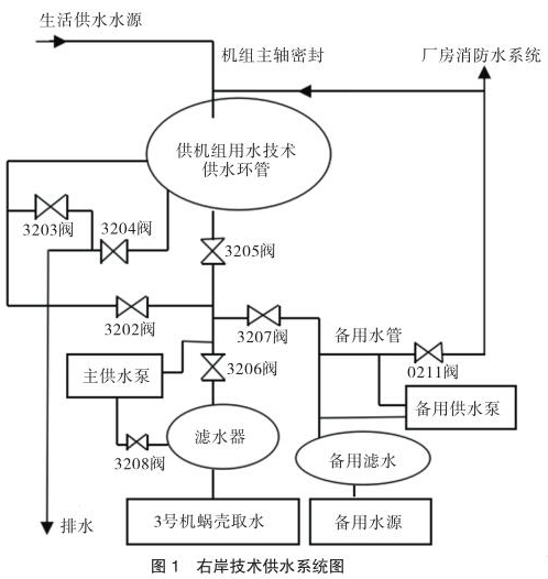 技術(shù)供水系統(tǒng)設(shè)有主、備用水源。主水源是蝸殼取水,作為機(jī)組技術(shù)供水的主用水源。備用水源有兩個(gè),一個(gè)是設(shè)在 1 號(hào)機(jī)段的壩前取水,取水口高程為 145m,另一個(gè)是同 4 號(hào)機(jī)組蝸殼取水共用取水口的蝸殼備用取水。兩路備用水源均接到備用總水管,并通過(guò) X207 閥分別與各臺(tái)機(jī)組的技術(shù)供水系統(tǒng)相連通(見(jiàn)圖 2)。