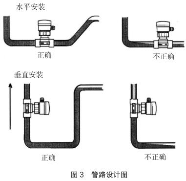 現(xiàn)場(chǎng)安裝時(shí)應(yīng)注意遠(yuǎn)離可能對(duì)其產(chǎn)生干擾的大型設(shè)備,防止長(zhǎng)期的熱輻射和其他如磁場(chǎng)直射等環(huán)境影響。為確保高測(cè)量精度和較好的零點(diǎn)穩(wěn)定性,進(jìn)行校正前,燃油流量表應(yīng)裝入工藝介質(zhì)中至少 24 小時(shí)電*鈍化。安裝的管路設(shè)計(jì)應(yīng)確保管道始終充滿流體,防止測(cè)量誤差,管路設(shè)計(jì)圖見(jiàn)圖 3。