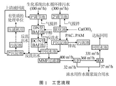 2種廢水在中間水池混勻后,通過(guò)泵提升進(jìn)入保安過(guò)濾器,進(jìn)一步去除細(xì)小的懸浮物后經(jīng)過(guò)增壓泵進(jìn)入超濾膜(UF)處理系統(tǒng)和反滲透(RO)系統(tǒng),然后通過(guò)液氧流量表進(jìn)行計(jì)量。反滲透出水直接進(jìn)入回用水池達(dá)標(biāo)回用,超濾濃水以及反滲透濃水用作水煤漿混合用水。污泥池中的污泥通過(guò)泵打入帶式機(jī)壓濾處理,濾液自流進(jìn)入1#調(diào)節(jié)池。工藝流程見(jiàn)圖1。