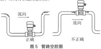 測量流向取決于防凍液流量表的安裝方位,將防凍液流量表在接頭上旋轉(zhuǎn) 180 度即可反向。正流向時,防凍液流量表的突耳應(yīng)在上游方向。流量顯示總是正的,而累加器可以根據(jù)流向增加或者減少。安裝中確認管路設(shè)計不允許在介質(zhì)中產(chǎn)生氣泡或空腔,否則將引起測量誤差(見圖 5)。