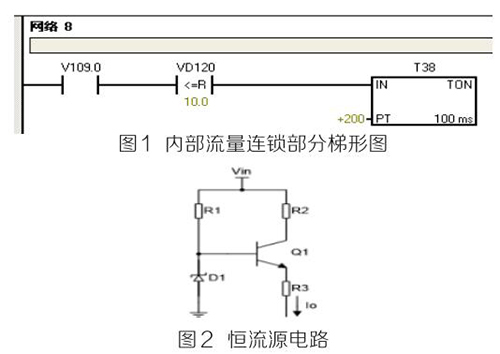 (2)PLC及模塊。PLC及模塊是自動(dòng)化控制系統(tǒng)主要設(shè)備,且PLC及模塊屬于高集成高精密電子設(shè)備,保持室內(nèi)整潔舒適,可以提高自動(dòng)化系統(tǒng)運(yùn)行穩(wěn)定性。PLC及模塊硬件運(yùn)行可靠,內(nèi)部控制程序是其控制核心軟件,如PLC硬件出現(xiàn)故障或損壞一般直接更換,但原內(nèi)部控制軟件無(wú)法上傳,整個(gè)控制系統(tǒng)成失控狀態(tài)。所以其內(nèi)部控制程序在調(diào)試驗(yàn)收合格后應(yīng)及時(shí)備份并做好標(biāo)記,為以后修復(fù)PLC故障提供保障。PLC系統(tǒng)的維護(hù)技術(shù)人員需掌握一定基礎(chǔ)PLC控制邏輯原理,對(duì)準(zhǔn)確判斷PLC故障點(diǎn)有很大的幫助。例如選礦廠水泵房S7-200系列PLC自動(dòng)抽水系統(tǒng)出現(xiàn)如下故障 :觸摸屏能控制變頻器啟動(dòng)水泵抽水,但在短時(shí)間內(nèi)會(huì)自動(dòng)停泵,導(dǎo)致無(wú)法正常抽水。通過(guò)故障現(xiàn)象可初步判斷PLC及模塊硬件設(shè)備正常,主要由于某個(gè)變量有問(wèn)題導(dǎo)致連鎖停機(jī)。打開備份PLC控制梯形圖程序進(jìn)行相關(guān)分析,原來(lái)是DN80汽油流量表瞬時(shí)流量數(shù)值做了連鎖,其在一定時(shí)間內(nèi)瞬時(shí)流量不大于10m 3 /h時(shí),自動(dòng)停泵,電磁流量模擬量輸出電流值僅為4ma且無(wú)變化,確定DN80汽油流量表有故障??膳R時(shí)應(yīng)急維修,模擬量模塊輸入模擬電流值10ma~20ma之間一固定數(shù)值即可恢復(fù)正常運(yùn)行。制作簡(jiǎn)單恒流源電路代替DN80汽油流量表輸出的模擬電流量,實(shí)現(xiàn)解決水泵無(wú)法正常運(yùn)行的故障。