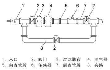 e.或選用自動(dòng)清洗型過(guò)濾器。若被測(cè)液體含有氣體.則應(yīng)在傳感器上游側(cè)裝消氣器。過(guò)濾器和消氣器的排污口和消氣口要通向安全的場(chǎng)所。