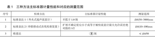 本規(guī)范包含三種校準方法,分別為標準表法 1(外夾式超聲流量計)、標準表法 2(串聯(lián)移動式在線校準裝置)和稱重法,編制組對每種方法進行了大量的實驗,并積*與熱水流量計生產廠家及用戶溝通探討,積累了豐富的經驗,獲得了大量的實驗數據,*終確定三種方法的主標準器計量性能和對應的測量范圍,如表 1 所示。