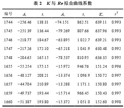 圖5是1744和1655兩支甲醇流量計(jì)Re與K擬合曲線圖。表2是流量計(jì)擬合曲線系數(shù)。通過(guò)r2值對(duì)擬合度進(jìn)行評(píng)估,10支甲醇流量計(jì)擬合優(yōu)度值處于0.992~0.998之間,擬合結(jié)果非常好。