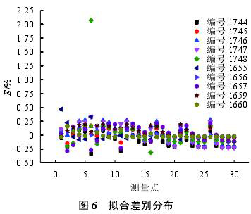 選取與以上要求的9個關(guān)鍵雷諾數(shù)相近的流量點數(shù)據(jù)進行擬合,并與全數(shù)據(jù)擬合結(jié)果進行比較,兩者差別通過式(9)進行評估。圖6是兩種擬合方式差別分布情況。300對數(shù)據(jù)點中,僅有1點儀表系數(shù)差別超過2%,其他各點差別均小于0.5%,而且99%以上的數(shù)據(jù)點差別小于±0.33%,86%以上的數(shù)據(jù)點差別小于±0.20%。