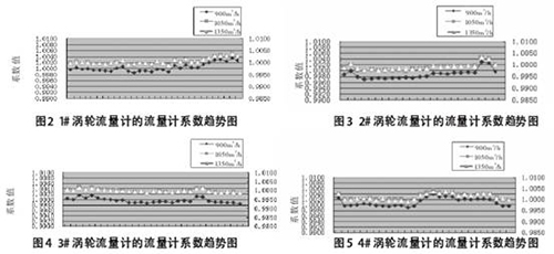 設(shè)有1套在線分析系統(tǒng),對(duì)原油密度、黏度和含水等**進(jìn)行檢測。柴油流量表的檢定采用體積管在線檢定,采用體積管對(duì)這4臺(tái)流量計(jì)檢定的流量計(jì)系數(shù)(流量計(jì)系數(shù)是流量計(jì)基本誤差的一種表示方法,貿(mào)易交接量=流量計(jì)讀數(shù)×流量計(jì)系數(shù))趨勢(shì)圖如圖2~圖5所示。