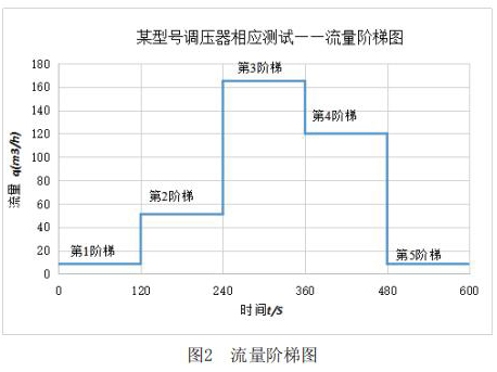 該測(cè)試主要利用實(shí)驗(yàn)室測(cè)試條件,模擬客戶(hù)現(xiàn)場(chǎng)使用情況。其主要測(cè)試內(nèi)容包括:測(cè)試液體智能渦輪流量計(jì)在+23℃,-30℃和-40℃三種溫度下,液體智能渦輪流量計(jì)出口壓力分別在2.1kPa和30kPa時(shí),流量分別從*1階梯到*5階梯時(shí)的響應(yīng)速度,客戶(hù)所提供的流量階梯如圖2所示。橫軸表示下游球閥開(kāi)啟動(dòng)作時(shí)間,縱軸表示液體智能渦輪流量計(jì)下游需要的流量q。