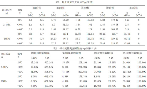為了深入研究溫度及流量突變對(duì)液體智能渦輪流量計(jì)響應(yīng)速度的影響趨勢(shì),把每個(gè)流量突變點(diǎn)前后的出口壓力p2,流量q列表如表1所示。