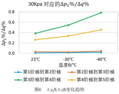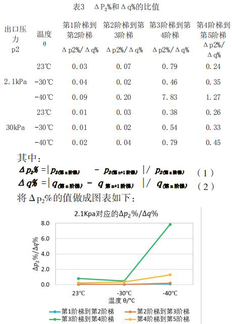 為了更直觀嚴(yán)謹(jǐn)?shù)膶?duì)比每個(gè)階段響應(yīng)速度的不同,對(duì)原始數(shù)據(jù)進(jìn)行處理,得到如下表格2和表格3。將△p2%/△q%作為響應(yīng)速度的直觀量化表達(dá),若△p2%/△q%的值大,說(shuō)明單位流量變化照成的出口壓力變化大,即說(shuō)明液體智能渦輪流量計(jì)響應(yīng)相對(duì)較慢,反之亦然。