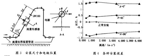 1)在本試驗(yàn)安裝條件下,流量傳感器電*軸在A一90。位置時(shí)*大誤差為一1.2,A一0。位置時(shí)為+1.6,A一45。位置時(shí)為0.5;與正常安裝條 件即參比值相比,*大附加誤差在A一90。時(shí)為一1.2,A==:0。時(shí)為+1.65,A一45。時(shí)為+0.65。