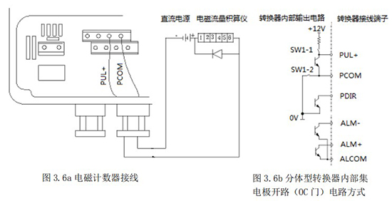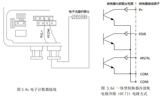 3.4.5 頻率(脈沖)、上下限報(bào)警、流向標(biāo)示等輸出均為集電*開路的電平輸出信號(hào)。