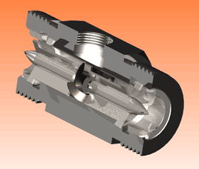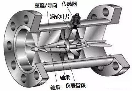 下圖就是一款液體渦輪流量計的透視圖,可以看到流量計的管道中心安放了一個渦輪,渦輪兩端由軸承支撐。
