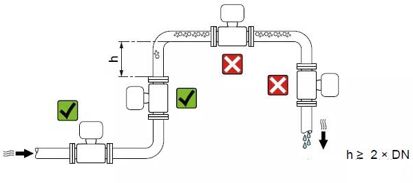 管路必須完全充滿液體。保證管路始終充滿液體至關(guān)重要,否則流量顯示會受到影響,而且還會出現(xiàn)測量錯誤。管路結(jié)構(gòu)的設(shè)計必須要保證測流管始終充滿流體。當流體有分流或含有固體顆粒沉淀物時,建議使用垂直安裝。但采用垂直安裝時,要遵循流體從下到上的走向,以保證管路充滿流體。