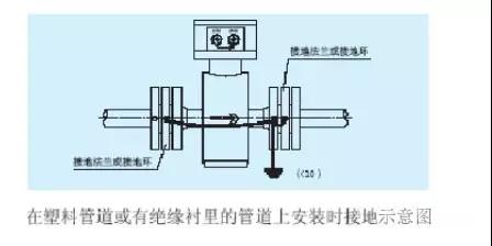 b.傳感器在塑料管道上或在有絕緣襯里的管道上安裝,傳感器的兩端應(yīng)安裝接地環(huán)、或接地法蘭、或帶有接地電*的短管,按下圖接地。使管內(nèi)流動(dòng)的被測(cè)介質(zhì)與大地短路,具有零電位,否則,補(bǔ)水流量計(jì)無(wú)法正常工作。