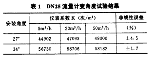 對DN25流量計分別做了葉片安裝角a為27°和34°的變角度試驗,其結(jié)果見表1和圖1。