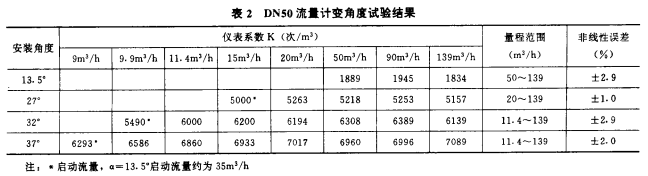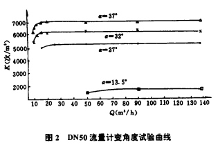 對DN50流量計分別做了a為13.5°、27°、32°和37°變角度試驗,其結(jié)果見表2和圖2。