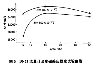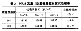 位于流量計之上,緊貼殼體處安裝著磁電轉(zhuǎn)換器,它將對渦輪葉片(由鐵磁性材料制成)產(chǎn)生一個恒定的磁性阻力矩。無論葉片處在靜止或轉(zhuǎn)動過程中都將始終受到這一磁力作用。這一磁力將直接影響著流量計的性能,尤其小流量時影響更大。為了研究該磁力對流量計性能的影響情況,我們選取適當(dāng)?shù)拇鸥袘?yīng)強度,對同一臺DN25流量計進行了變磁感應(yīng)強度B的影響試驗,其試驗結(jié)果見表3和圖3。