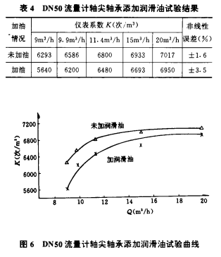 通過試驗表明,潤滑油對流量計小流量的性能的影響較大,隨著流量的增大,兩條曲線之間的差值逐漸減小。由于軸尖和軸承的摩擦阻力很小,并且采用硬質(zhì)合金材料制成,耐磨性很強,故建議流量計在出廠標(biāo)定前可以不必加入潤滑油。
