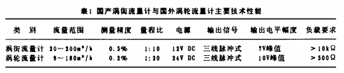 電池供電渦輪流量計與國外渦輪流量計的主要技術性能如表l所示。表1中為采用公稱直徑為100的傳感器測量范圍。